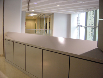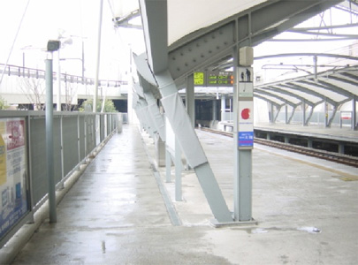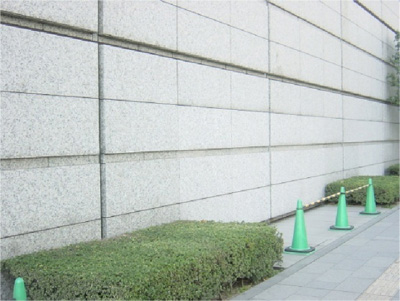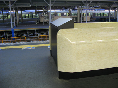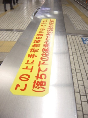 | 幅のある水平面は物を置くことを“アフォード”する。階段の立ち上がり壁の天端を水平にすると物が置かれて危険。 | エスカレータまわりの手すり壁の天端を傾斜や曲面にしてものが置けないようにしたデザイン(事前対策) | |