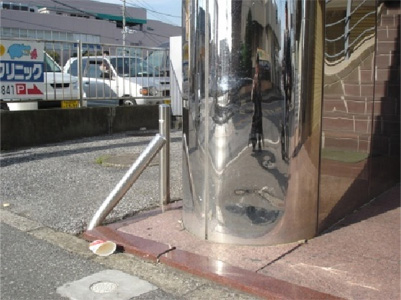 周囲にとけ込ませて存在を消そうとするデザインも、使う場所によっては問題が生じる。ステンレス鏡面仕上げの柱に車がぶつかる、シャッターのガイドレールを納めたステンレス仕上げの柱に人がぶつかるなどの事故が、その一例である。