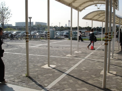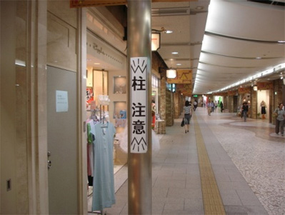 | ステンレス鏡面仕上げの柱がへこみ、ステンレス製バリカーも曲がっている。車がぶつかったためと思われる | 「柱 注意」と書かれたステンレスの柱。柱が細いこと、周囲に気をとられやすい場所であることも人がぶつかる一因であろう | 明るい屋外では細くて白い柱が特に見えにくくなる。ぶつかり防止のため、目の高さにトラテープが4列に巻かれている |