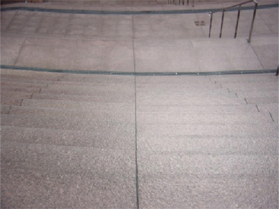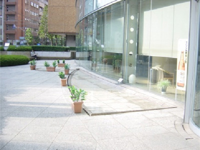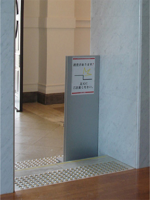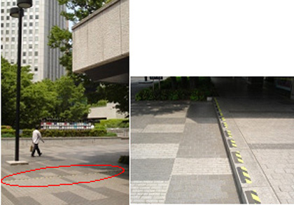 | 段鼻がわかりにくい階段では思わず立ち止まることがある。弱視の人には斜路に見える | 歩道と池の底が同仕上げで水深が浅いため、池に気付かずに踏み入れやすい |