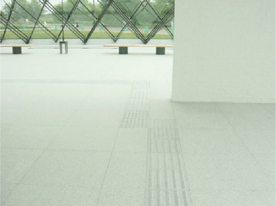 白色の床に埋められた白色の点字ブロックは、つまずく原因にもなる |