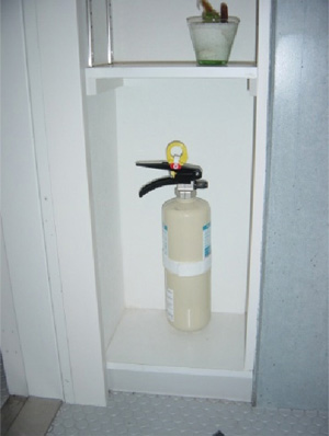 防火扉、屋内消火栓、消火器ボックスの扉を周囲の壁と完全に同化させると、緊急時にそれらの存在に気付きにくく、また平常時は扉の前に物を置く行為を誘発する。