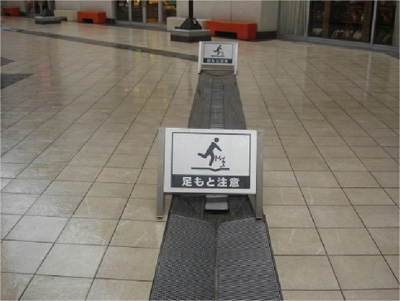 V字形に凹んだ排水溝の蓋の断面形状は見誤りやすい。また、床置きの注意書きは新たな危険要因にもなる