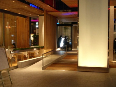 華やかなインテリアやディスプレイに目を奪われやすいところに階段を設けるのは危険。転倒事故の発生により階段が斜路に改修され、斜路が二つ並んでしまった(左の斜路はもとからあったもの)