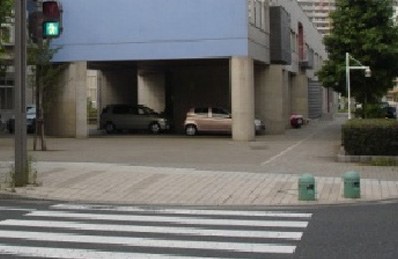 柱は垂直であるという思いこみ、グレーで目立たない色が、ぶつかり事故を生む。事後対策として柱にクッション材が巻かれているが、柱や周囲と同色であるため、注意喚起効果は期待できない