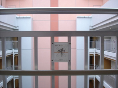 超高層集合住宅の吹抜に面した廊下の手すりに書かれた「のぼらないで!」の注意書き